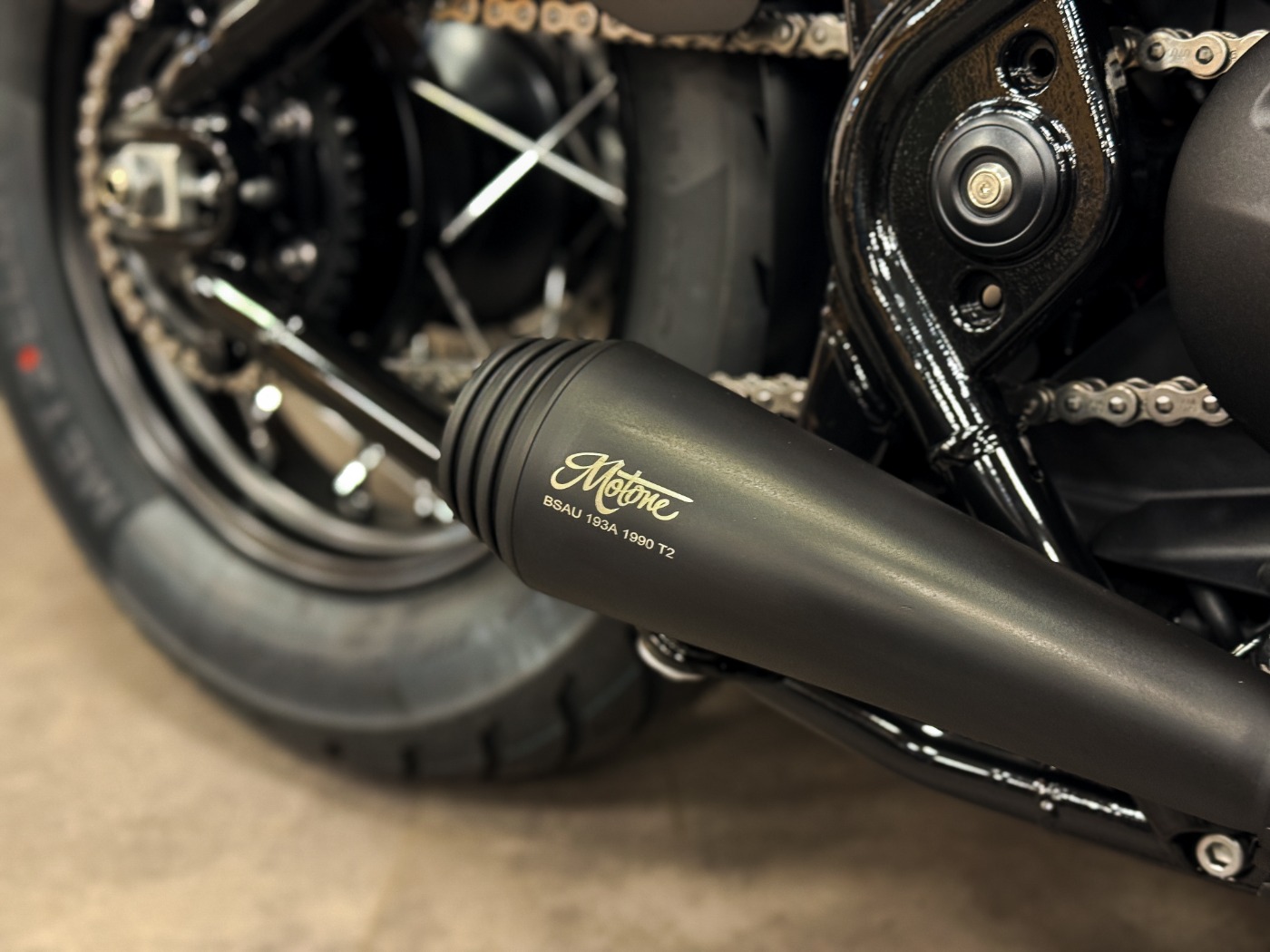 De volledige uitlaatlijn werd vervangen door een matzwarte setup met Motone Customs einddempers.