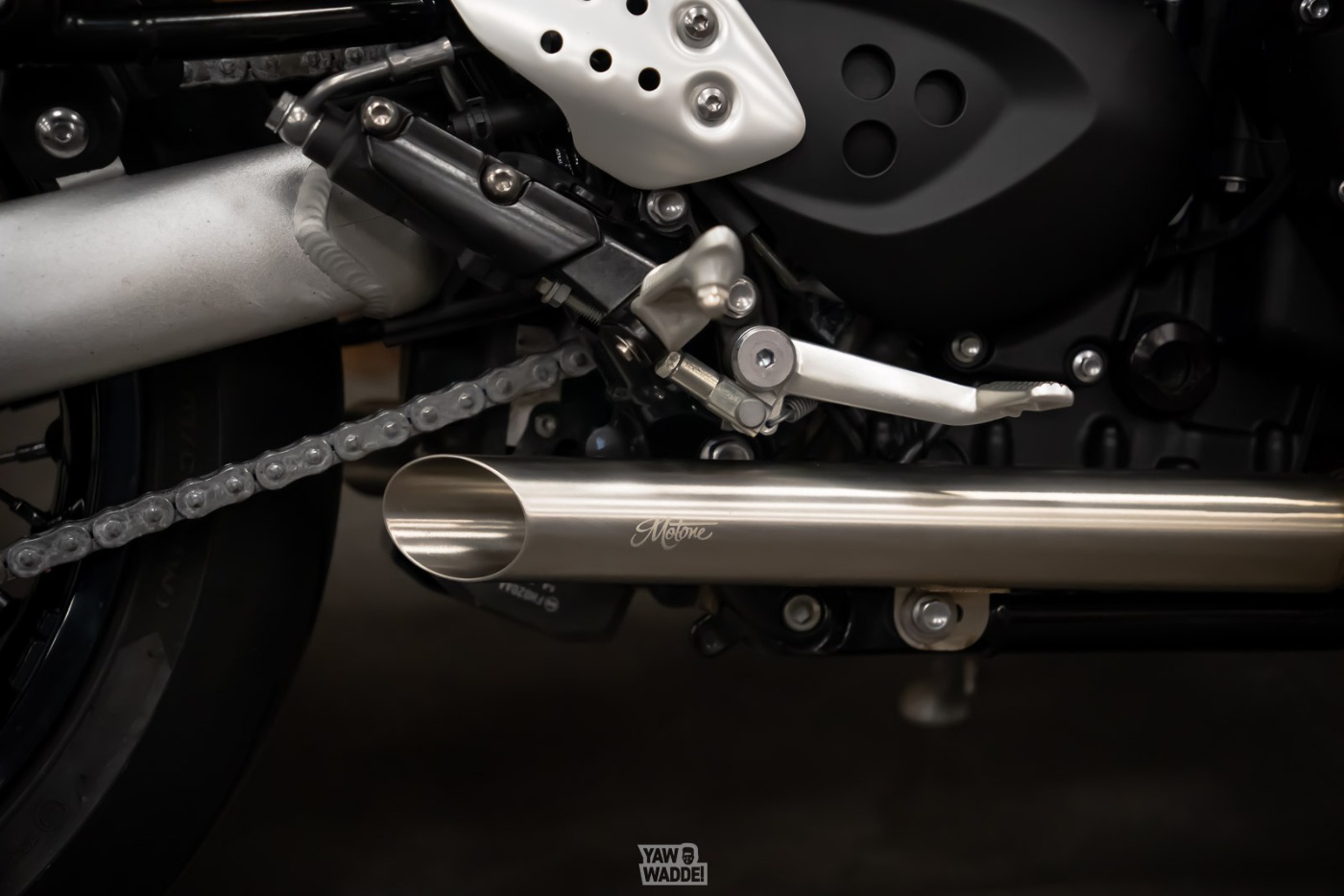 Deze Thruxton ademt nu via Motone Nautilus uitlaten, zonder katalysator en zonder DB-killers.