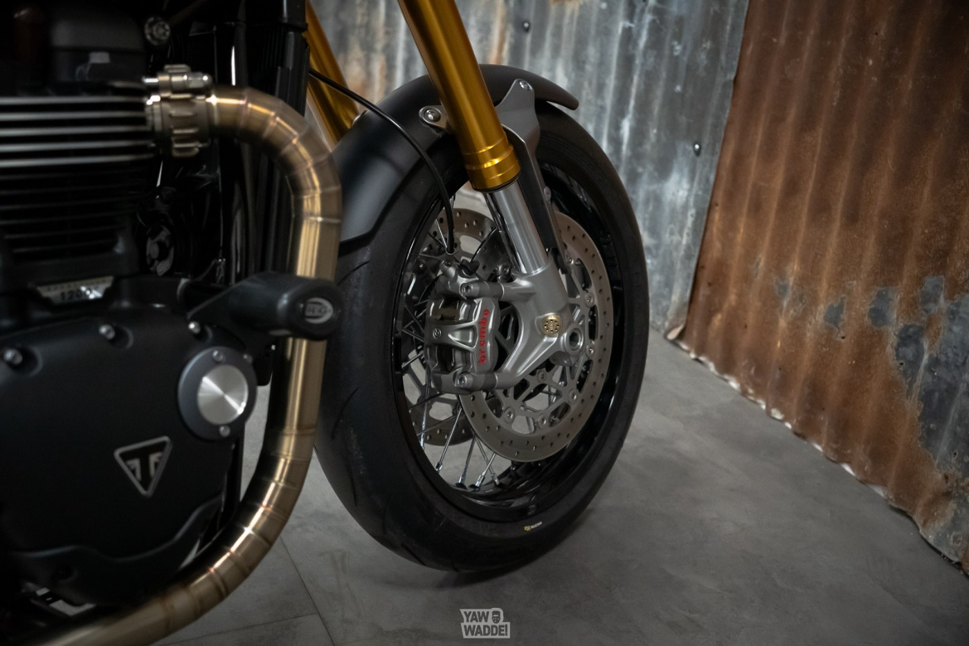 Qua bescherming kreeg deze Thruxton R&G valbescherming en originele Triumph motorbeschermers. Mooi én nuttig.