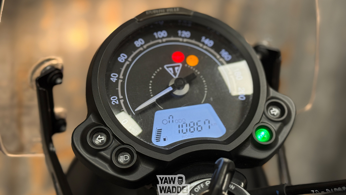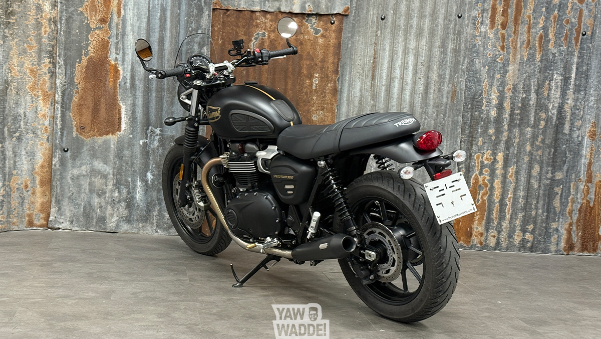 Matt zwart, goudkleurige vintage 1907 Triumph-logo’s en een uitstraling die meer attitude heeft dan een kat met honger.