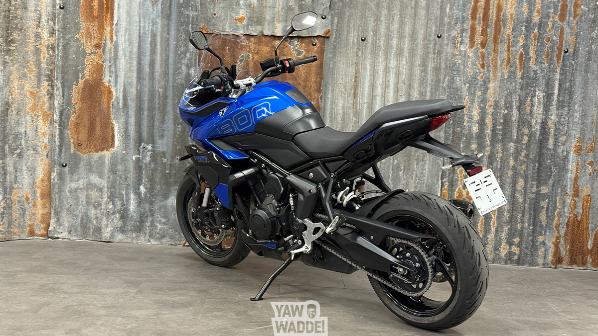 Deze Tiger Sport 800 in Caspian Blue is er eentje die alles doet. Comfortabel voor woon werk, plezant in de Ardennen, stabiel op de snelweg en scherp genoeg om elke bocht leuker te maken dan de vorige.