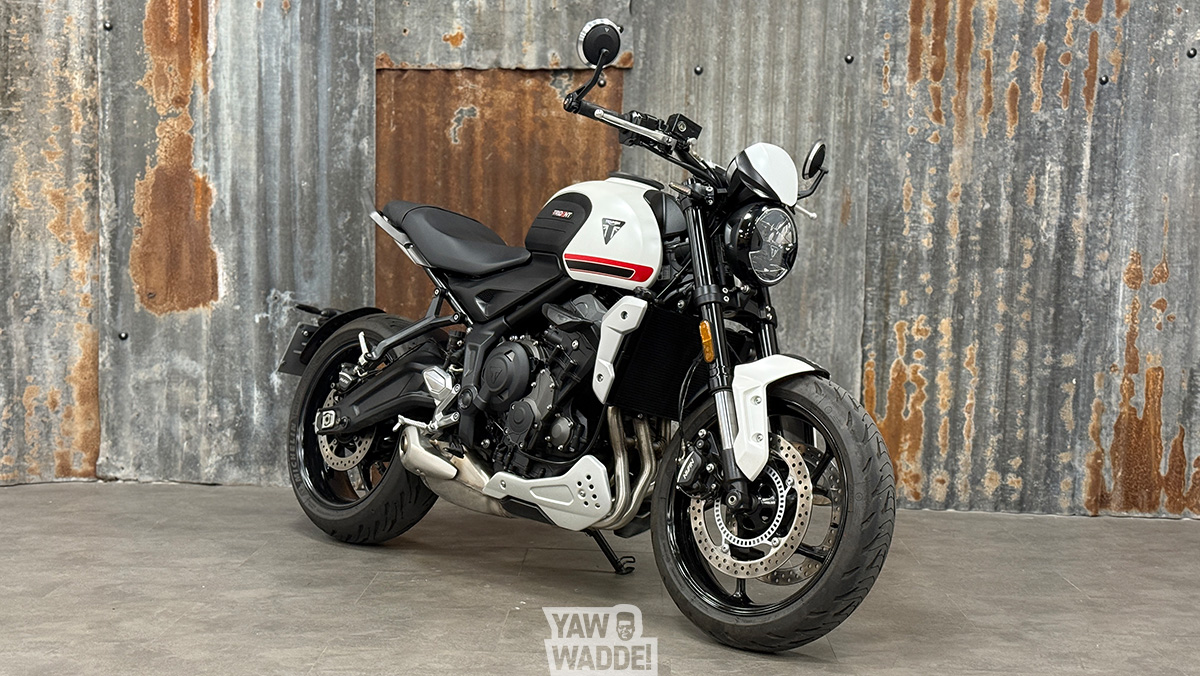 ๐ Kom deze prachtige Trident 660 in mat Crystal White bewonderen in onze showroom – maar pas op: één proefrit en je wil niet meer afstappen.
