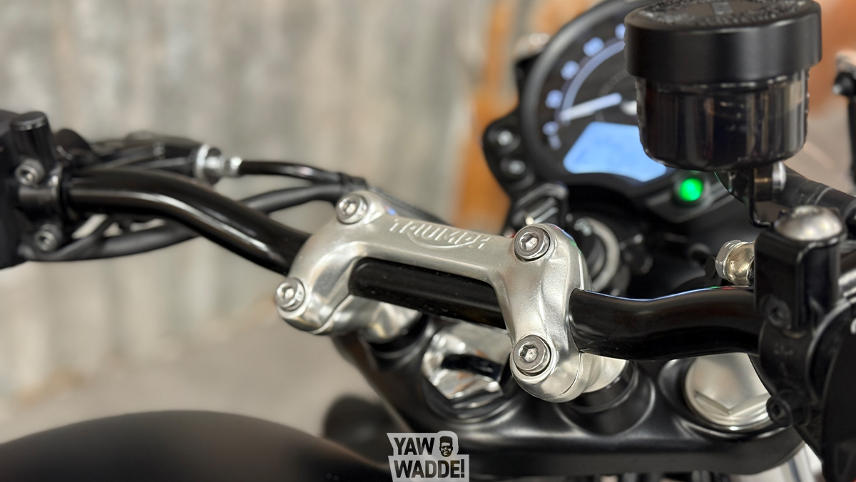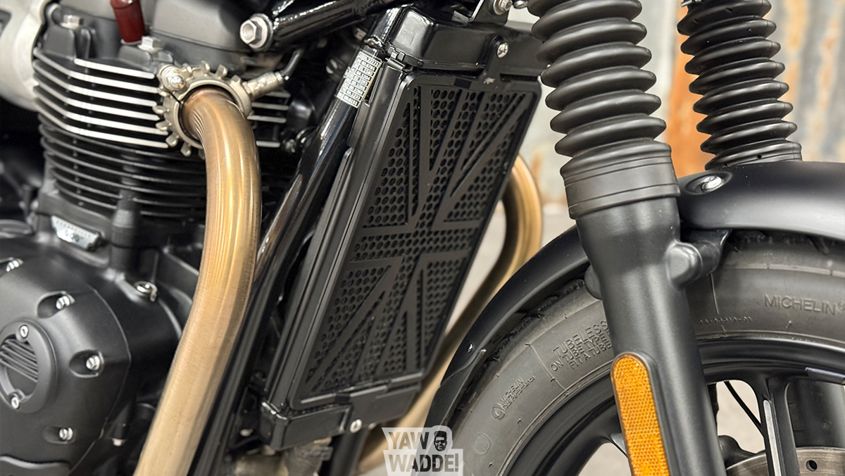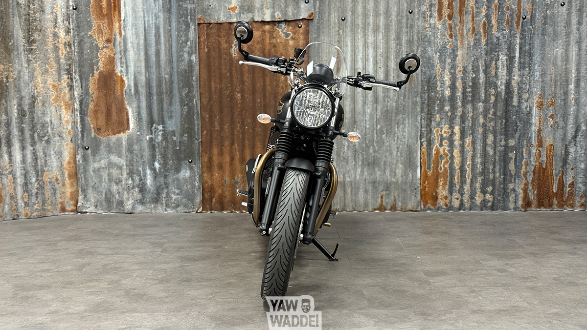 Matt zwart, goudkleurige vintage 1907 Triumph-logo’s en een uitstraling die meer attitude heeft dan een kat met honger.